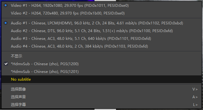 4音轨:LPCM(2ch) / DTS(5.1ch) / AC3(5.1ch) / AC3(2ch),第4条音轨是伴奏